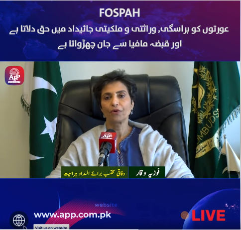 FOSPAH Gives women the right to inherit and own property and gets rid of the mafia: Fauzia Waqar February 20,3:02 PM