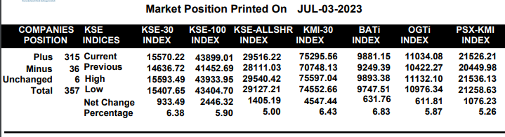ISLAMABAD, Jul 3 (APP):Bullish trend dominated at the 100-index of the Pakistan Stock Exchange (PSX), as it witnessed historic single-day gain of 2,446 points on Monday, a positive change of 5.90 per cent, closing at 43,899.01 points against 41,452.69 points the previous trading day.