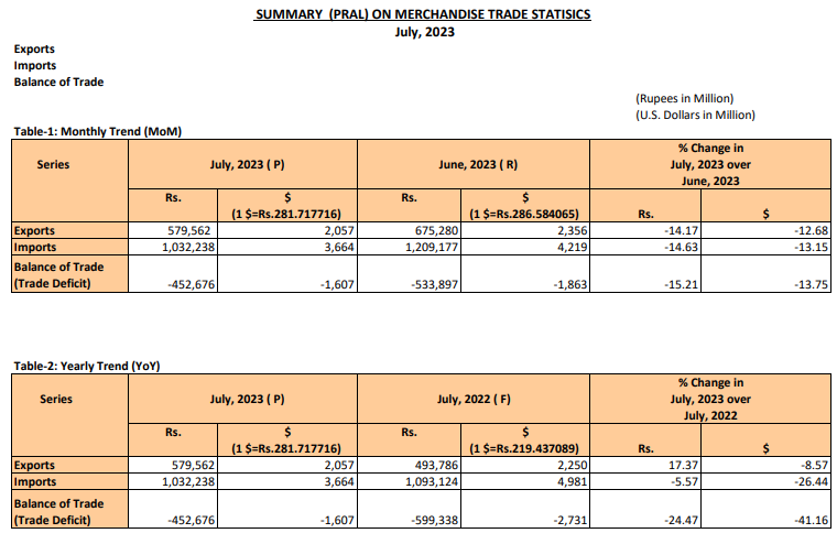 The trade deficit during the month under review was recorded at $1.607 billion against the deficit of $2.731 billion in July 2022, a decline of 41.16 percent.