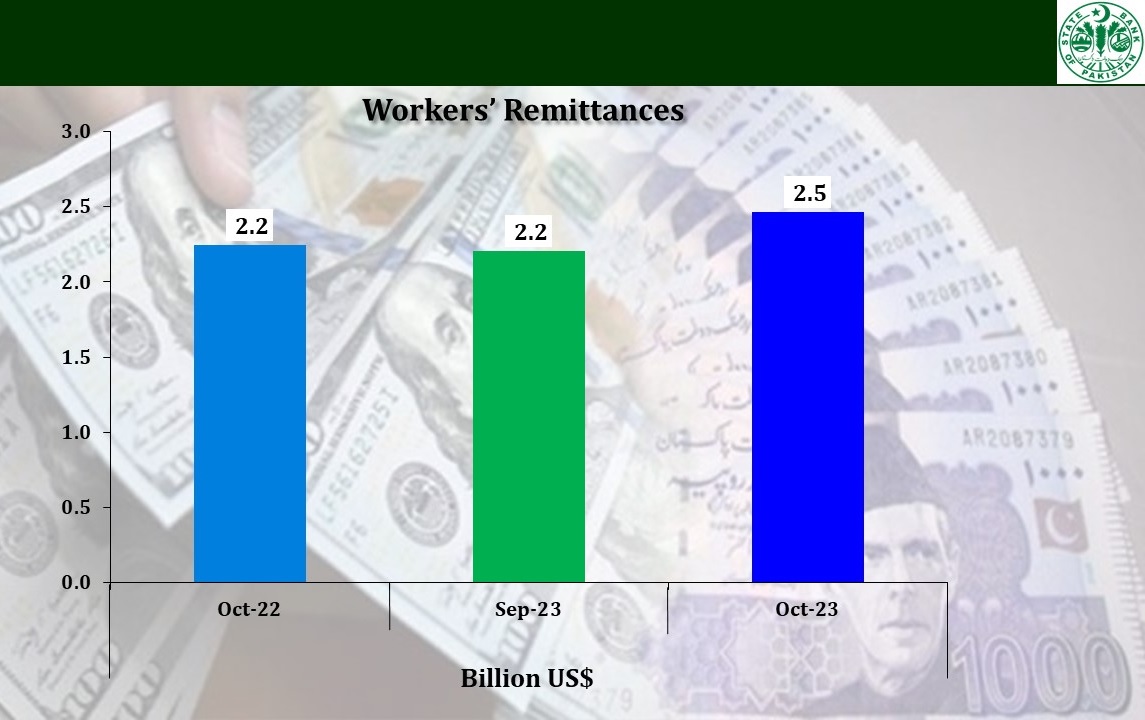 ISLAMABAD, Nov 10 (APP): The overseas workers’ remittances recorded an inflow of US$2.5 billion during October 2023, the State Bank of Pakistan (SBP) on Friday said.
