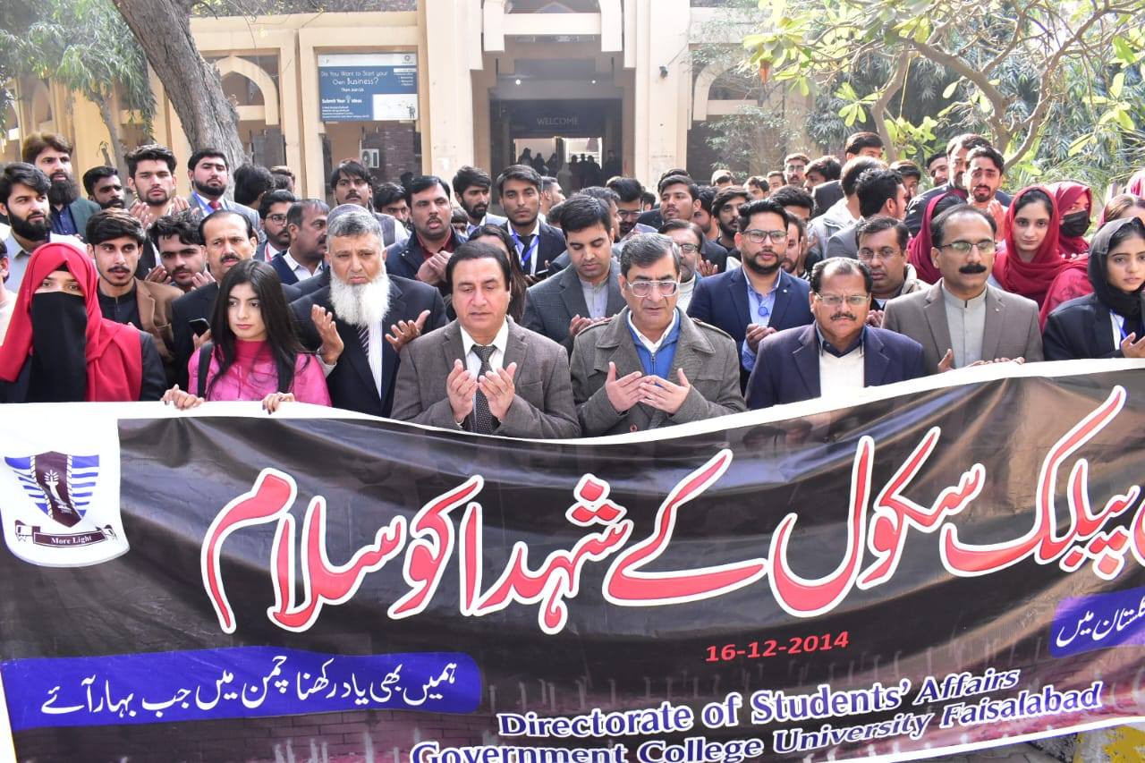 FAISALABAD, Dec 16 (APP):Government College University Faisalabad (GCUF) on Tuesday organized a prayer and condolence ceremony along with a solidarity walk to commemorate the martyrs of the Army Public School (APS), Peshawar.