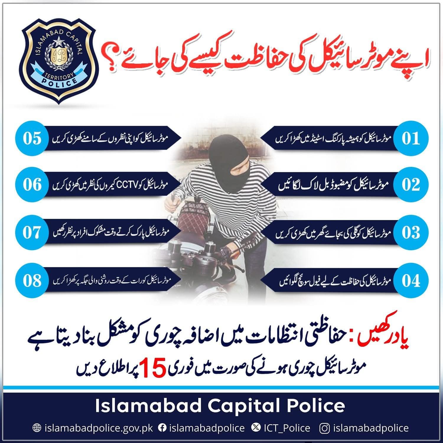 ISLAMABAD, Dec 11 (APP):Islamabad Capital Territory (ICT) Police have issued eight key safety precautions for citizens to help protect their motorcycles from theft and reduce related crime in the federal capital.