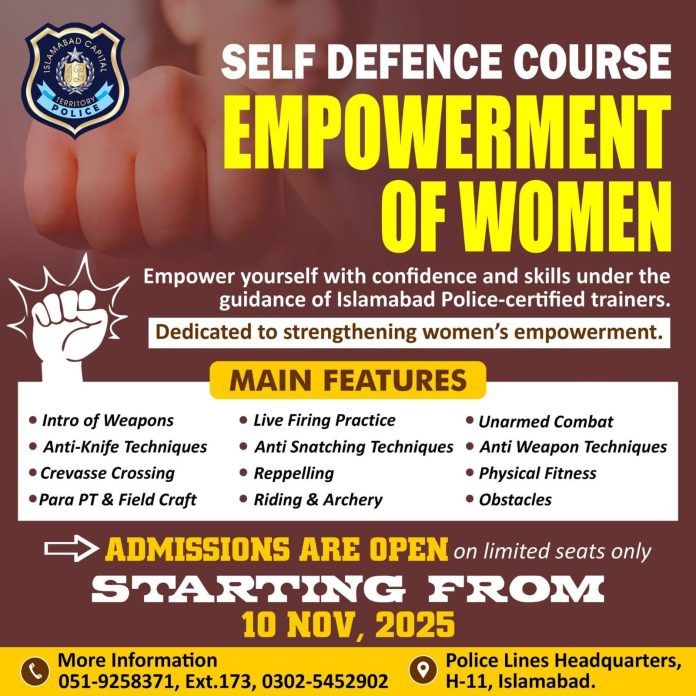 ISLAMABAD, Oct 20 (APP):Islamabad Capital Territory (ICT) Police has announced the launch of a new self-defense course dedicated to empowering women, starting November 10, 2025, at Police Lines Headquarters, H-11, Islamabad.