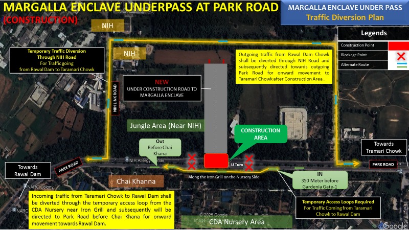 Similarly, traffic travelling from Tramri towards Rawal Dam Chowk will be diverted from Chai Khana, passing through the CDA Nursery area and along the iron grill, using two temporary roads to re-enter Park Road, he added.