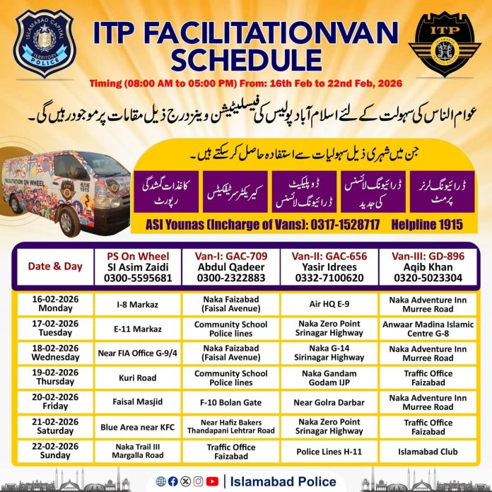ISLAMABAD, Feb 15 (APP):Islamabad Traffic Police (ITP) will deploy its mobile facilitation vans at various locations across the federal capital from February 16 to February 22, 2026, to provide essential services to citizens.