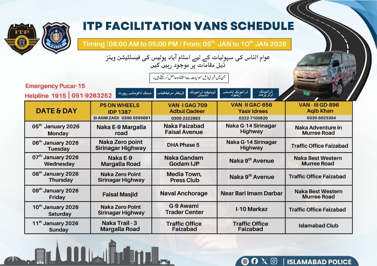 ISLAMABAD, Jan 05 (APP):Islamabad Traffic Police (ITP) has announced the schedule of its facilitation vans to provide on-the-spot public services at different locations of the federal capital from January 5 to January 11.