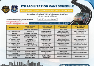 ISLAMABAD, Jan 11 (APP):The Islamabad Traffic Police (ITP) has announced the weekly deployment schedule of its facilitation vans, including the Police Station on Wheels, to provide citizens easy access to essential policing services across the federal capital from 12 to 18 January 2026.