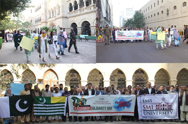 KARACHI, Oct 27 (APP):Sindh Madressatul Islam University observed Kashmir Black Day on Friday at the campus. The students exhibited posters carrying images of Kashmiri people who were victimized by the hands of Indian forces. The event was organized by the Directorate of Students Affairs and Counseling of SMIU. The Vice Chancellor of SMIU, Dr. Mujeeb Sahrai, was the chief guest.