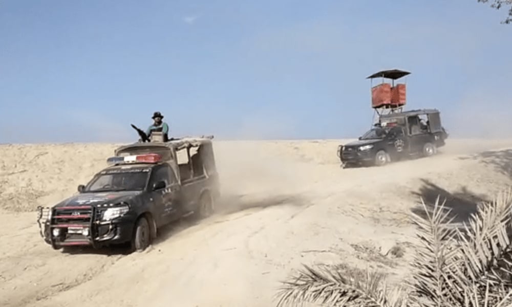 The operation involves a large police force, including Senior Superintendent of Police (SSP) Shikarpur and SSP Larkana, and is equipped with armored vehicles and modern machinery.