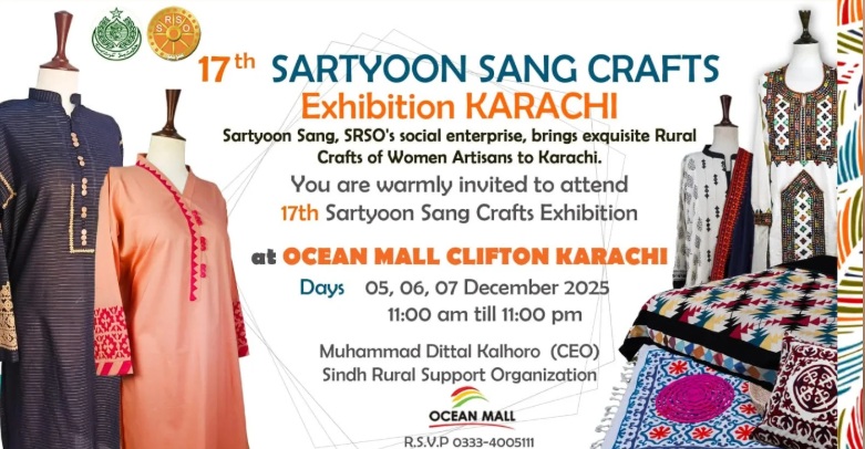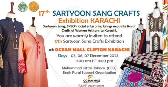 SUKKUR, Dec 01 (APP):Thousands of rural women artisans from across Sindh will display their handicrafts at the 17th Sartyoon Sang Crafts Exhibition at Ocean Mall, Clifton. The three-day event, organized by the Sindh Rural Support Organisation (SRSO) in collaboration with the Sindh government, will be open to the public from Friday, December 5, 2025 to Sunday, December 7, 2025.
