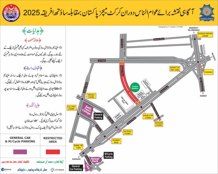 RAWALPINDI, Oct 16 (APP):The Rawalpindi Traffic Police on Thursday issued a comprehensive traffic management plan for the upcoming Pakistan–South Africa cricket matches to ensure the smooth flow of traffic and convenience of the public.