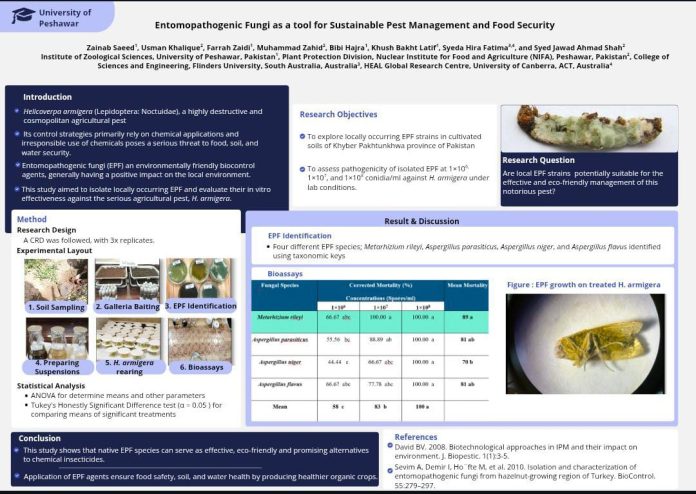 To address these challenges, Zainab Saeed’s research explored the potential of Entomopathogenic Fungi (EPF), environmentally friendly biological control agents known for their positive impact on the local ecosystem.