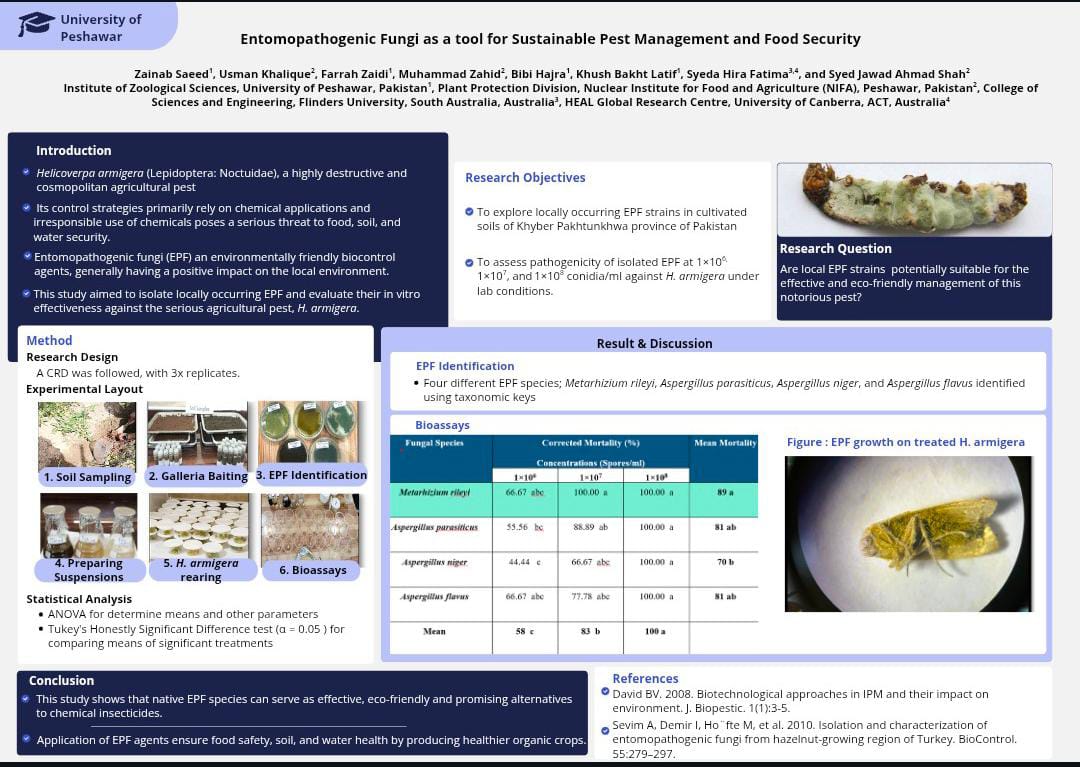 Under the supervision of Dr. Farrah Zaidi, Associate Professor at the Institute of Zoological Sciences and Research Co-supervisor, Deputy Chief Scientist, NIFA Dr Syed Jawad Ahmad Shah, Zainab Saeed presented her MPhil research through an e-poster titled “Entomopathogenic Fungi as a Tool for Sustainable Pest Management and Food Security.”