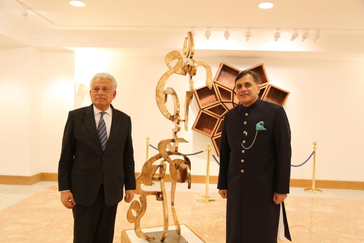 The gifted sculpture, created by renowned Pakistani artist Amin Gulgee, is from his acclaimed Zero Gravity II series. The work features the fifth verse of Surah Al-Alaq – one of the earliest verses revealed to the Prophet Muhammad (Peace Be Upon Him) – “[He] taught humankind what they knew not” (Quran 96:5) – rendered in elegant Naskh calligraphy and dramatically deconstructed into seven floating, interconnected components that appear to defy gravity.