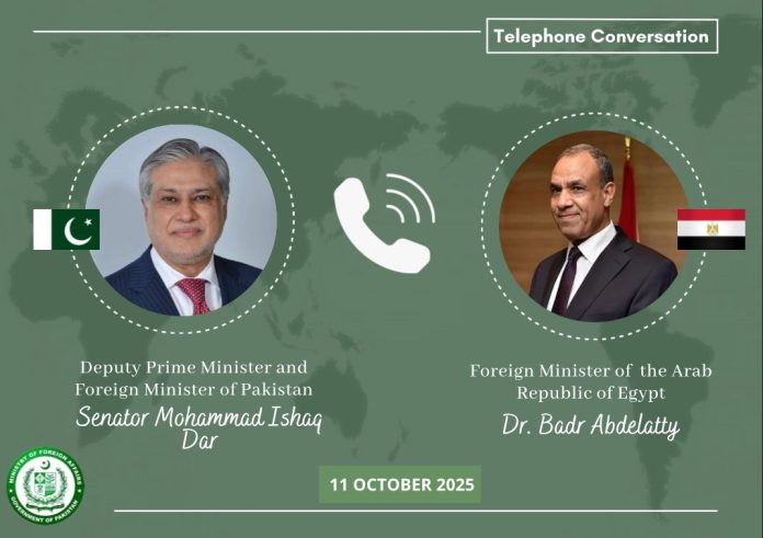 ISLAMABAD, Oct 11 (APP): Deputy Prime Minister/Foreign Minister Senator Mohammad Ishaq Dar and Egyptian Foreign Minister Dr. Badr Abdelatty on Saturday exchanged views on the ongoing situation in the Middle East, particularly the developments in Gaza and Palestine.