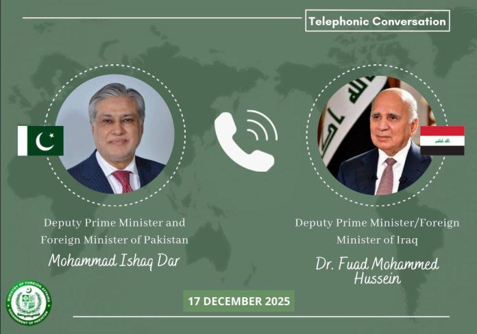 ISLAMABAD, Dec 17 (APP): Deputy Prime Minister/Foreign Minister Senator Mohammad Ishaq Dar and Deputy Prime Minister and Foreign Minister of Iraq Dr. Fuad Mohammed Hussein, Wednesday, reaffirmed the brotherly Pakistan–Iraq relations, exchanged views on strengthening bilateral cooperation, and highlighted the importance of high-level exchanges.