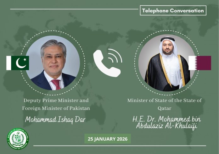 ISLAMABAD, Jan 25 (APP): Deputy Prime Minister / Foreign Minister Senator Mohammad Ishaq Dar, Sunday, spoke on the phone with Dr. Mohammed bin Abdulaziz Al-Khulaifi Qatar Minister of State.