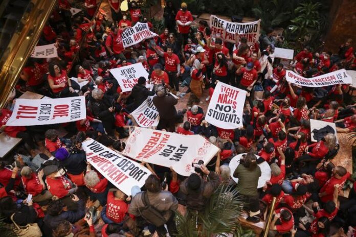 In the lobby of Trump Tower, about 300 people donning red shirts chanted slogans seeking the release of Khalil and held anti-Israel banners, said Sonya Meyerson-Knox, a spokesperson for Jewish Voice for Peace, a group critical of Israel and U.S. policies toward the Palestinian territories. Over the weekend, federal immigration agents detained Khalil, a 30-year-old permanent U.S. resident, as officials said they revoked his status in the country.