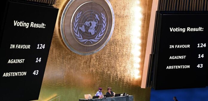 The resolution mustered 124 votes in favour, while 43 countries abstained, and Israel, the United States and 12 others voted no.