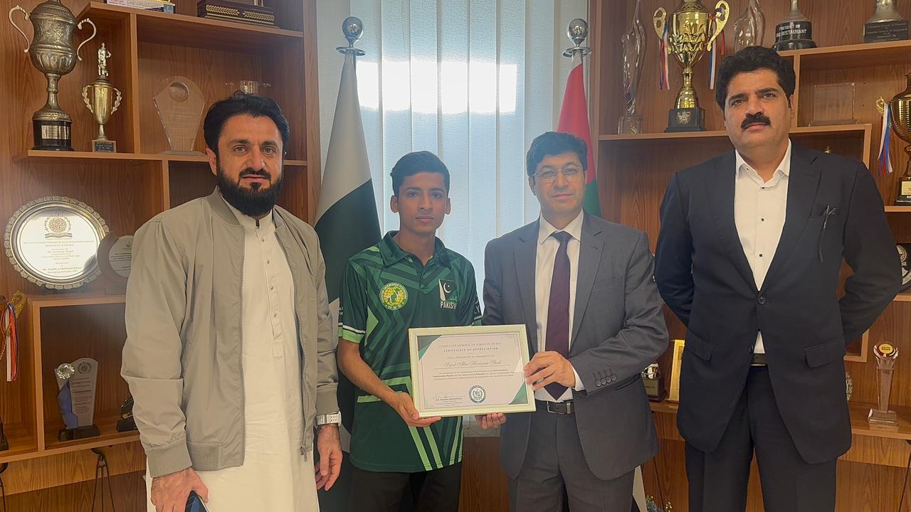 DUBAI, Feb 13 (APP): Consul General of Pakistan in Dubai Hussain Muhammad on Friday met with Syed Abu Huraira Shah, a talented young Pakistani international Taekwondo athlete who has represented Pakistan at various competitions.