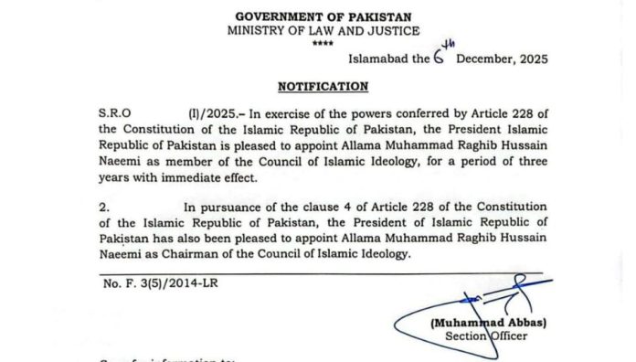 ISLAMABAD, Dec 6 (APP): President Asif Ali Zardari has reappointed Allama Muhammad Raghib Hussain Naeemi as Chairman of the Council of Islamic Ideology (CII) for three-year term.