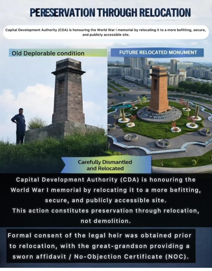 In a statement issued here, the department said though the WWI Monument is located within the limits of Islamabad Capital Territory, it is not a protected side under the relevant Act.