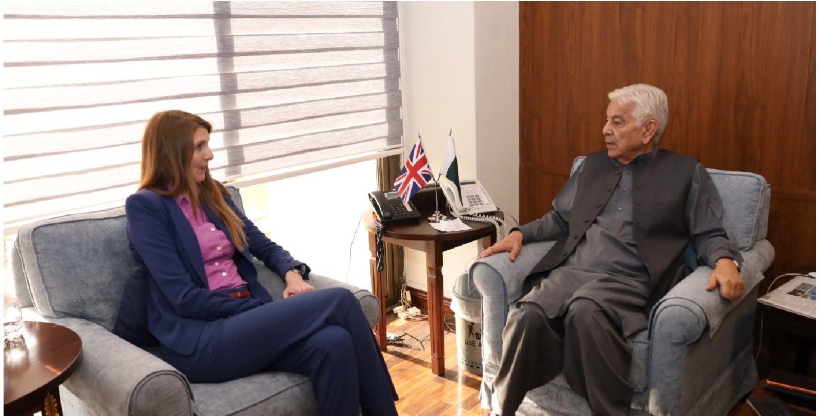 ISLAMABAD, Oct 13 (APP): British High Commissioner to Pakistan, Jane Marriott called on Minister for Defence, Khawaja Muhammad Asif here Monday.