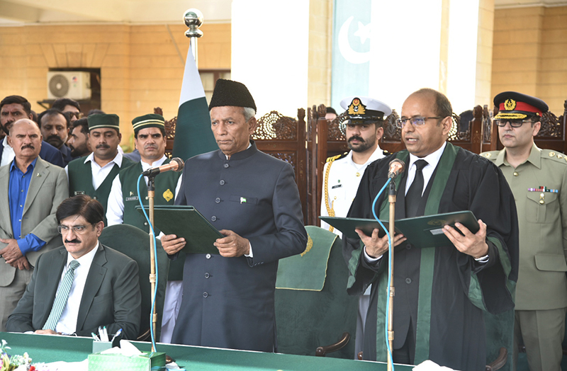 Chief Justice Zafar Ahmed Rajput administers the oath to Syed Muhammad Nehal Hashmi as Governor of Sindh at Governor House. APP/ABB