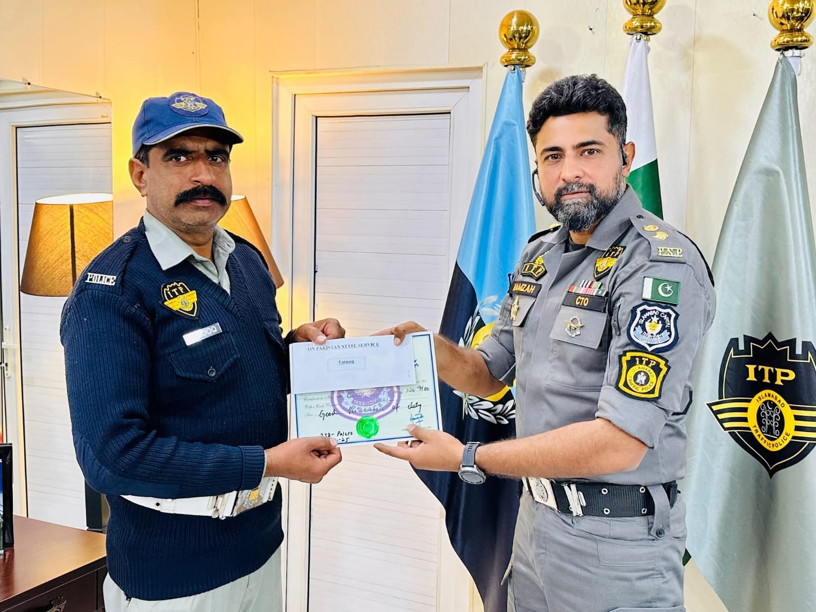 ISLAMABAD, Dec 05 (APP): Chief Traffic Officer (CTO) Islamabad Captain (R) Hamza Humayun awarded commendation certificates and cash rewards to 11 Islamabad Traffic Police (ITP) lift-operator officers for their effective action against illegal parking and related violations.