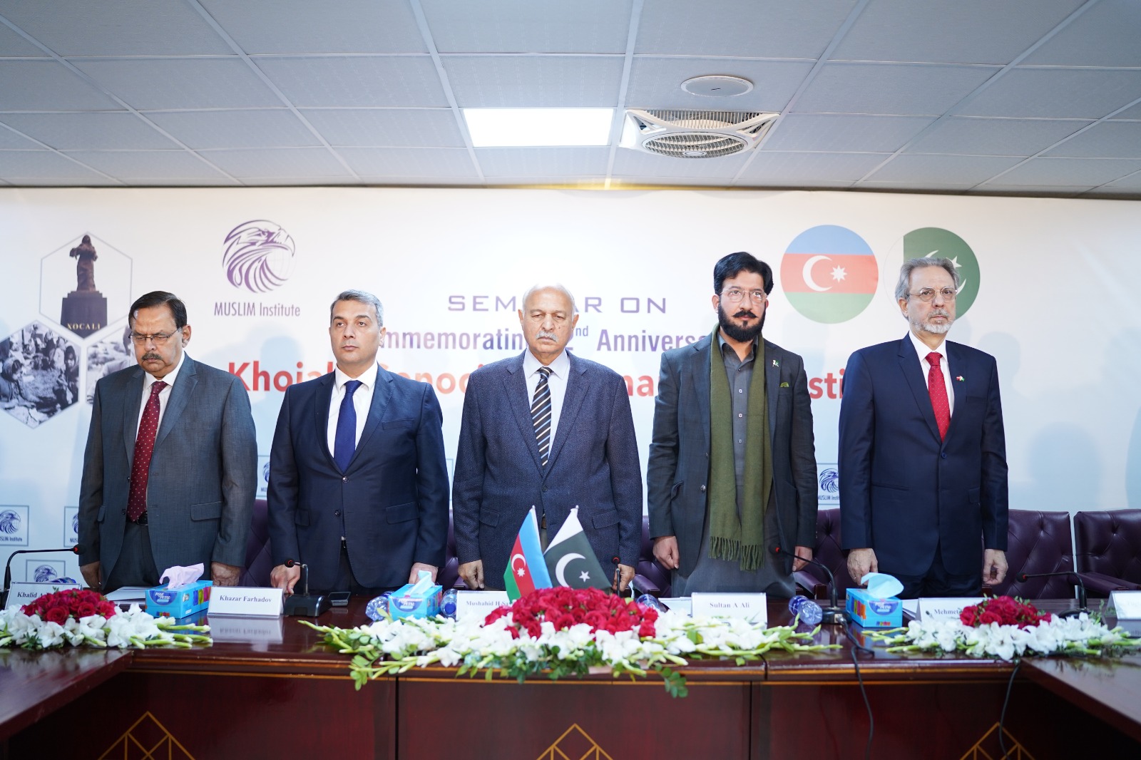 Earlier a one-minute silence was observed to honour the martyrs of Khojaly genocide and later a brief documentary highlighting the history of Genocide in Nagorno-Karabakh by the Armenian occupant forces and unbridled violence and atrocities against the innocent Azerbaijanis and fateha (prayer) was also offered for Khojaly martyrs.