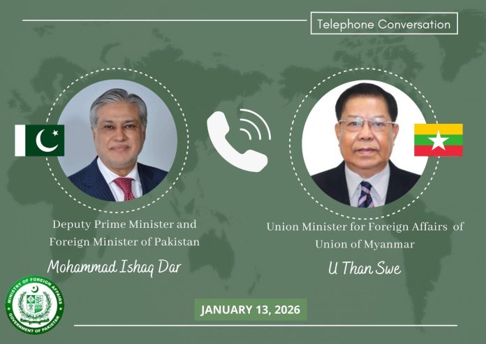 ISLAMABAD, Jan 13 (APP): Deputy Prime Minister/Foreign Minister Senator Mohammad Ishaq Dar, Tuesday, held a telephone conversation with Myanmar’s Foreign Minister U Than Swe.