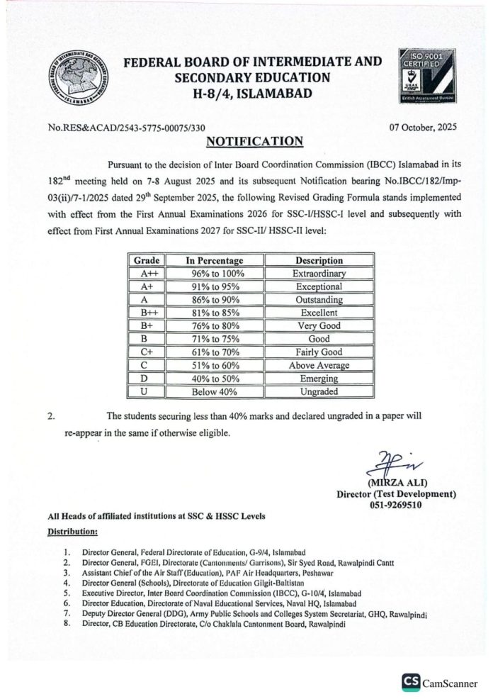 The revised grading scheme stands implemented with effect from first annual examinations for 2026 for SSC-I and HSSC-I level and subsequently with effect from first annual examinations 2027 for SSC-II and HSSC-II level.