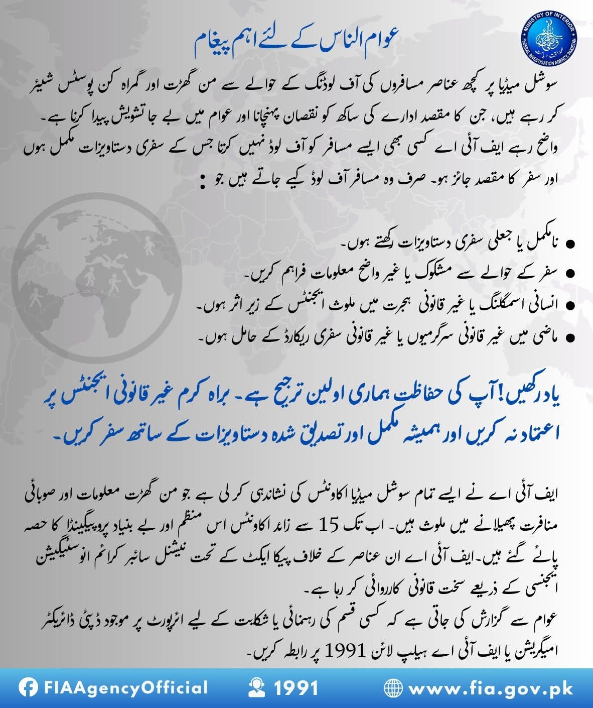 ISLAMABAD, Nov 27 (APP):The Federal Investigation Agency (FIA) has urged citizens to beware of fake, misleading and fabricated social media posts regarding the offloading of passengers, calling them an attempt to create panic and damage the agency’s credibility.
