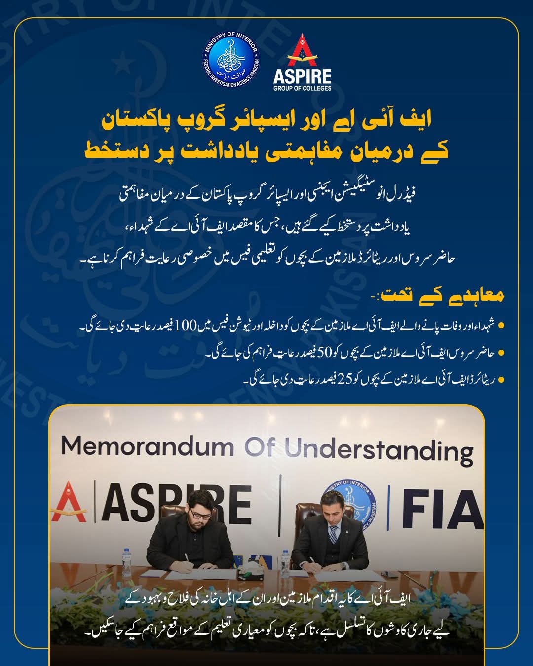 ISLAMABAD, Feb 01 (APP):The Federal Investigation Agency (FIA) has signed a Memorandum of Understanding (MoU) with Aspire Group of Colleges to provide special educational fee concessions for the children of FIA employees across the country.