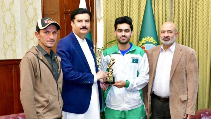 However, Khushhal Riaz Khan was unable to attend the ceremony at that time due to his participation in a training camp in preparation for the National Games. He formally received his award today during a meeting with the Governor at Governor House Peshawar.