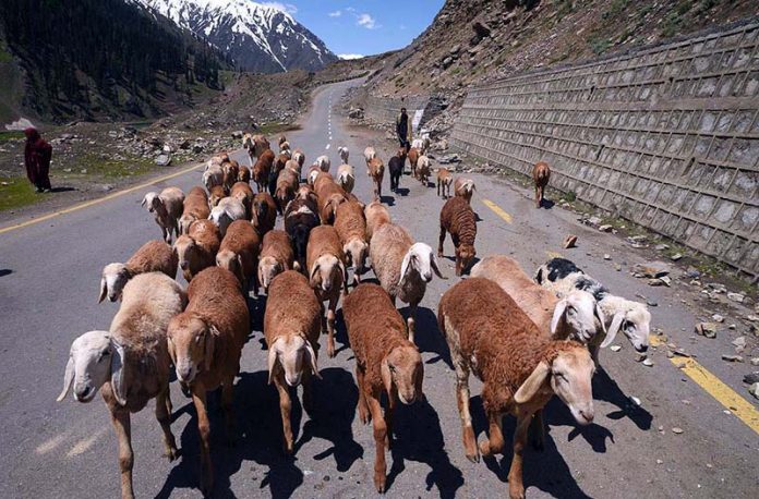 Gypsy man guarding a herd of sheep towards the grazing field at Babusar Top area