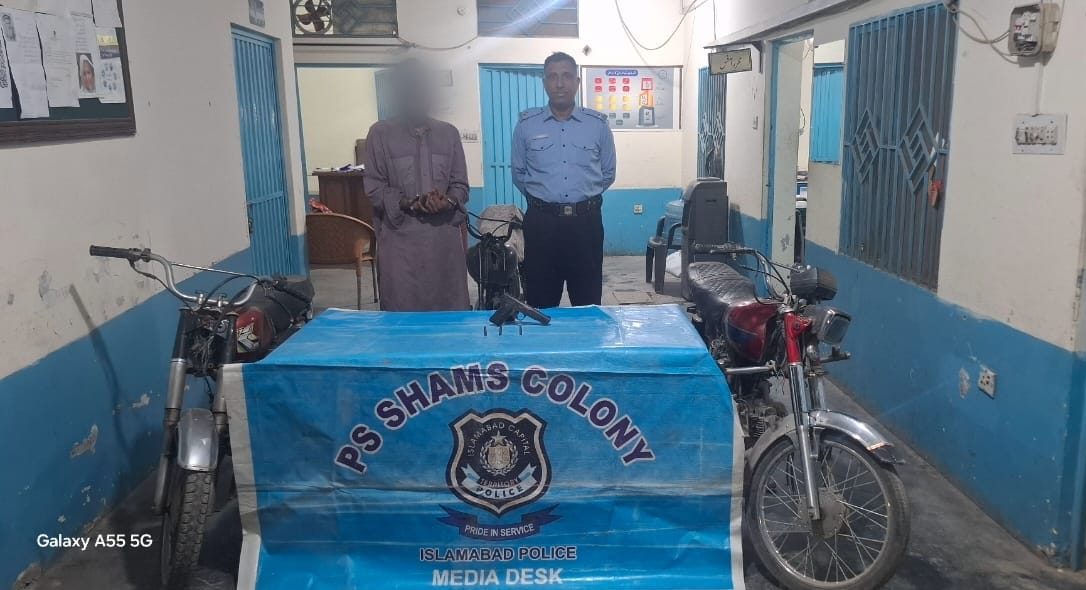 Islamabad Capital Territory (ICT) Police have arrested a previously involved motorcycle thief and recovered stolen motorcycles and a weapon during a major operation in the jurisdiction of Shams Colony Police Station.