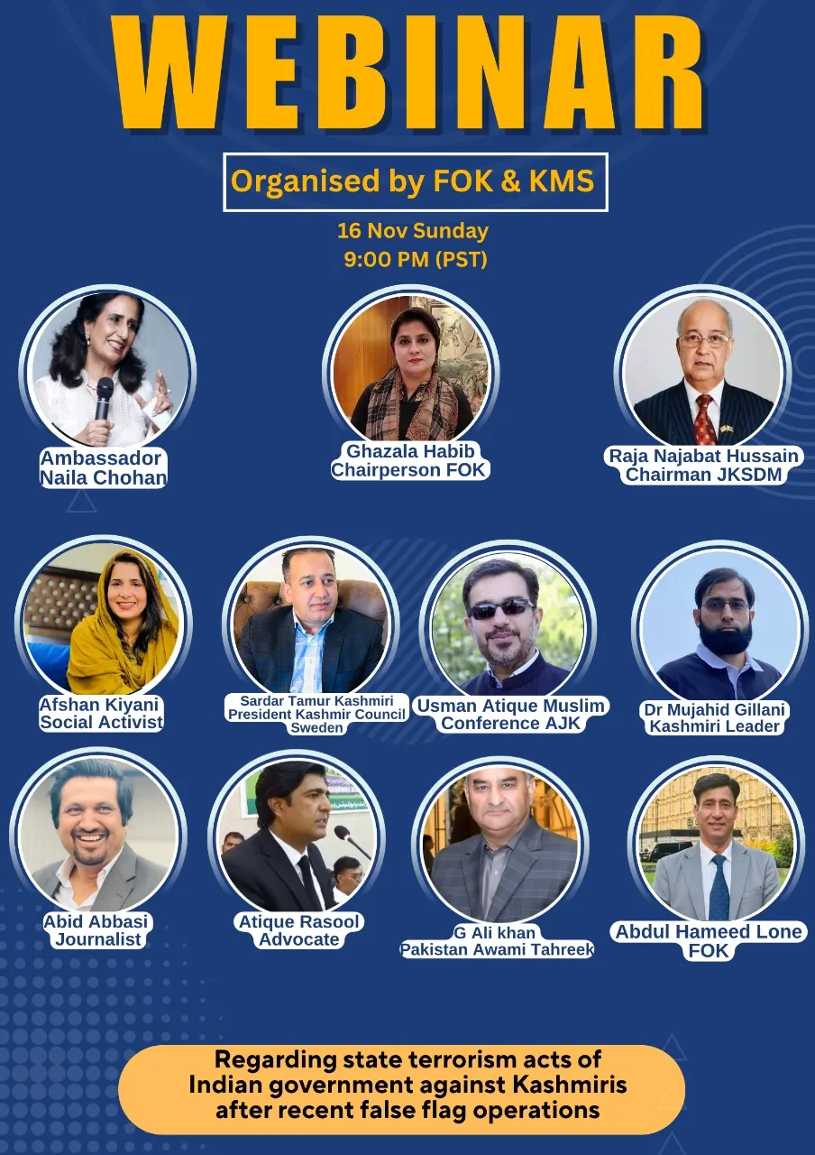 ISLAMABAD, Nov 17 (APP): Prominent activists, journalists and leaders from Pakistan, Sweden, USA , UK and Kashmir spotlight the human rights crisis in Indian illegally occupied Jammu and Kashmir during a virtual webinar organised by Friends of Kashmir International and Kashmir Media Service (KMS).