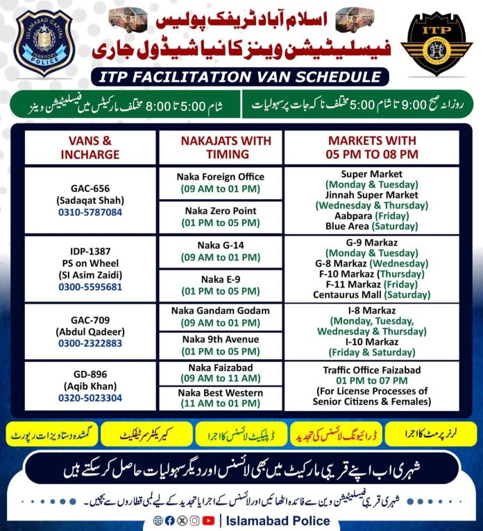 ISLAMABAD, Dec 21 (APP): Islamabad Traffic Police (ITP) has issued a 15-day schedule for its facilitation vans, from December 22, 2025 to January 4, 2026, to provide licensing and other traffic-related services at designated police checkposts during the day and in major markets during evening hours across the federal capital.