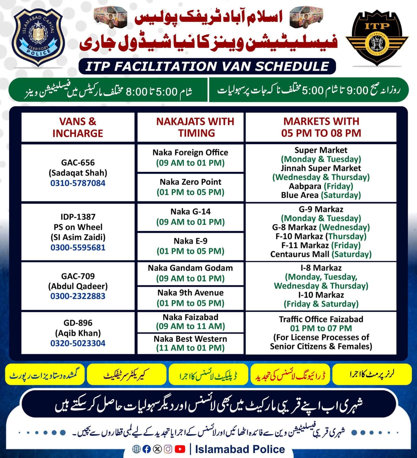 An ITP spokesperson told APP on Sunday that the facilitation vans will operate daily from 9:00 am to 5:00 pm at various police checkposts, while from 5:00 pm to 8:00 pm, the vans will remain available in different markets to ensure easy access to services for citizens.