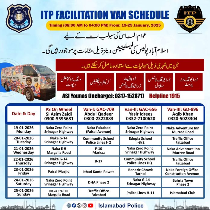 ISLAMABAD, Jan 18 (APP):Islamabad Traffic Police (ITP) has announced the deployment schedule of its facilitation vans and Police Station on Wheels at different checkpoints and locations across the federal capital from January 19 to January 25, 2026, to provide traffic- and police-related services at citizens’ doorsteps.