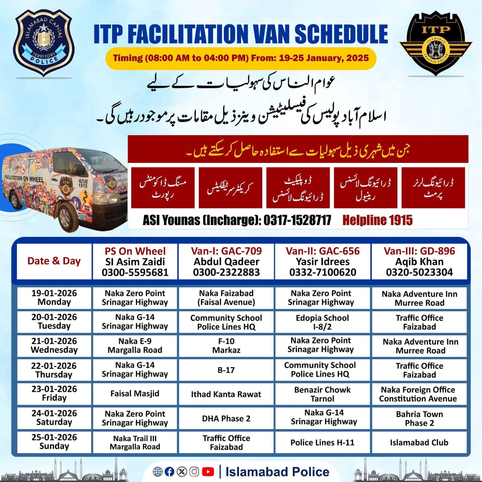 On Monday (January 19), the Police Station on Wheels will be available at Zero Point Checkpoint, Srinagar Highway, while Van-I will be stationed at Faizabad Checkpoint (Faisal Avenue), Van-II at Zero Point Checkpoint, Srinagar Highway, and Van-III at Adventure Inn Checkpoint, Murree Road.