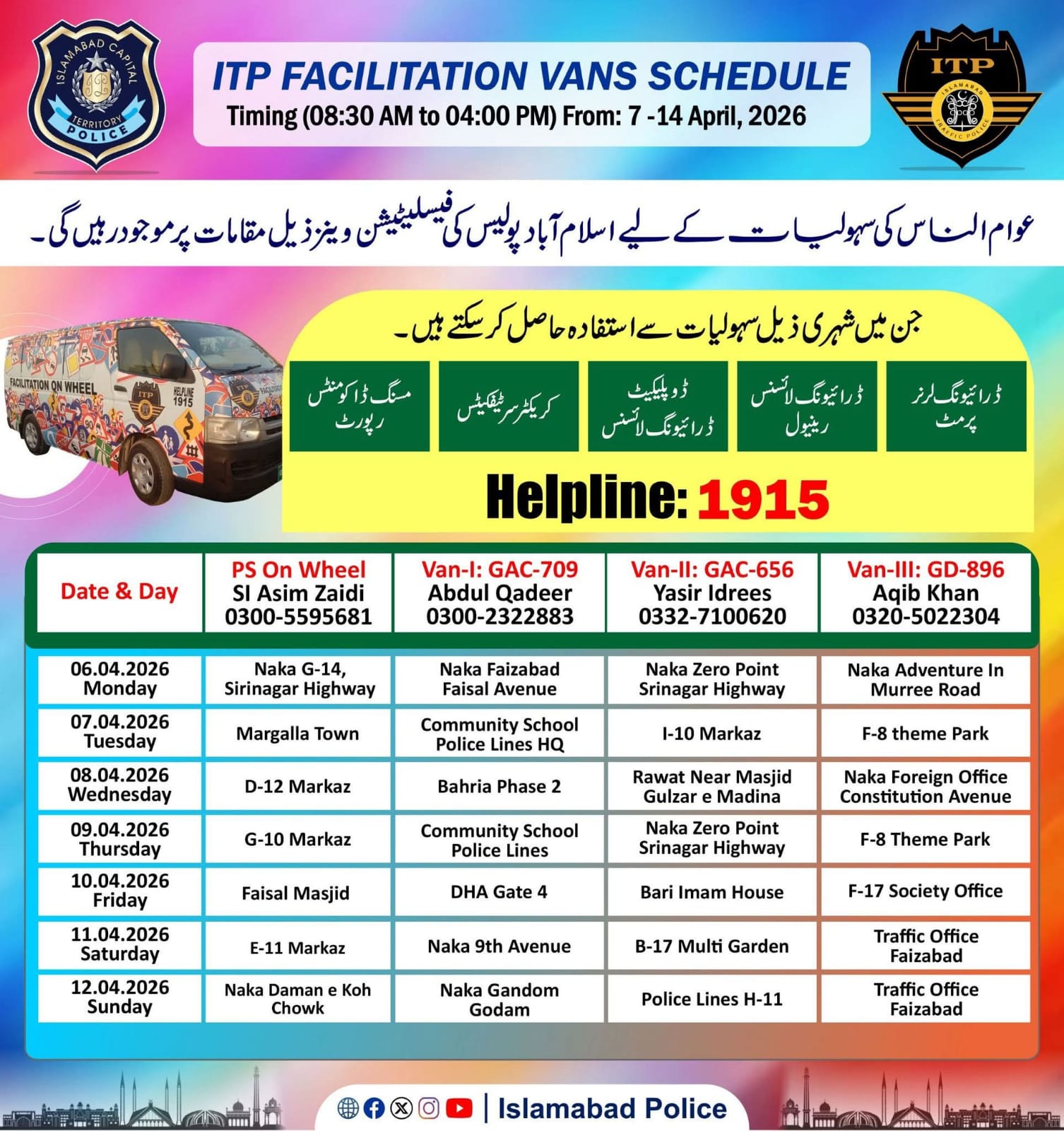ISLAMABAD, Apr 05 (APP):Islamabad Traffic Police (ITP) has issued a weekly schedule of its mobile facilitation vans along with Police Station on Wheels (PS on Wheels) to provide services to citizens at different locations across the federal capital from April 6 to 12, 2026.