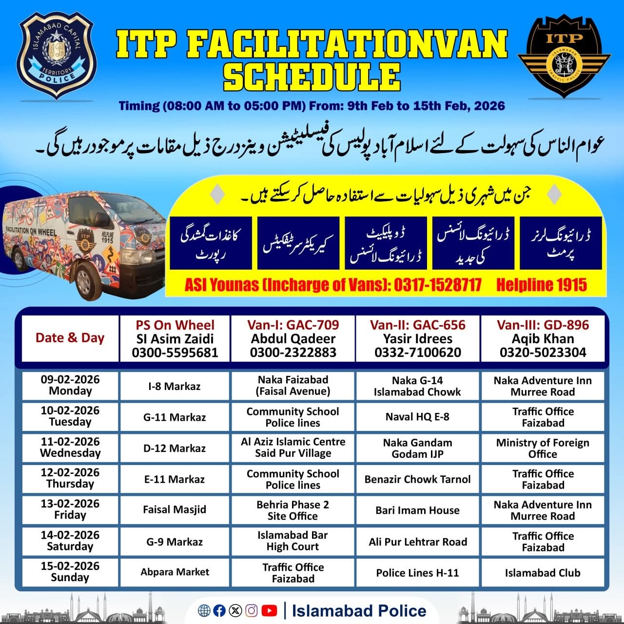 ISLAMABAD, Feb 08 (APP): Islamabad Traffic Police (ITP) will deploy its mobile facilitation vans at various locations across the federal capital from February 9 to February 15, 2026, to provide traffic and police-related services to citizens at their doorsteps.