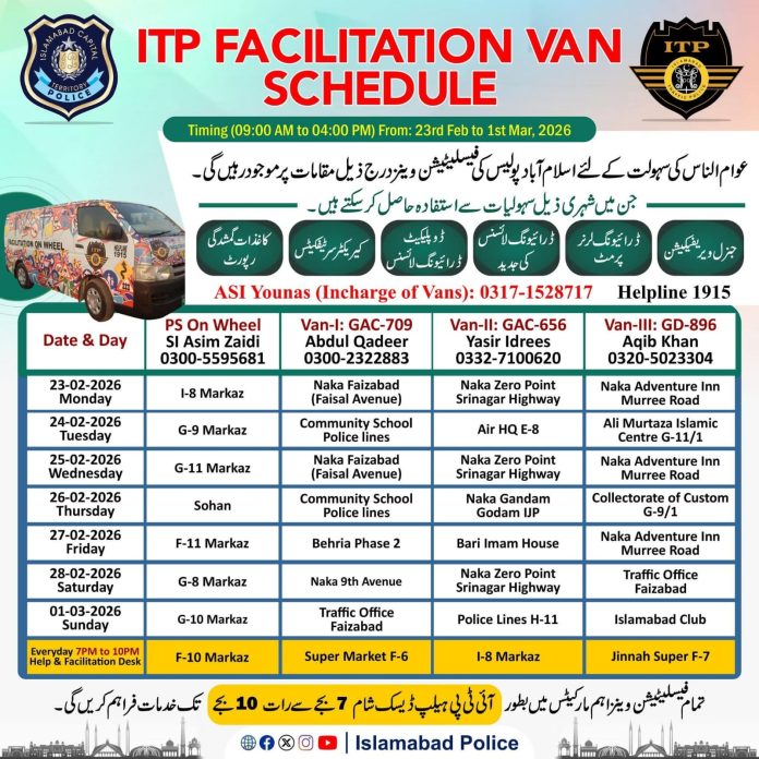 ISLAMABAD, Feb 22 (APP):Islamabad Traffic Police (ITP) has announced a week-long deployment plan for its Facilitation Vans to provide essential traffic-related services at multiple locations across the federal capital from February 23 to March 1, 2026.