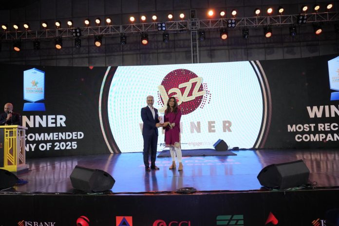 ISLAMABAD, Oct 18 (APP):Jazz, Pakistan’s leading digital operator, has been recognised as the Most Recommended Company of 2025 at the Best Place to Work Pakistan Awards, organised by the Pakistan Society of Human Resource Management (PSHRM) and Engage Consulting.