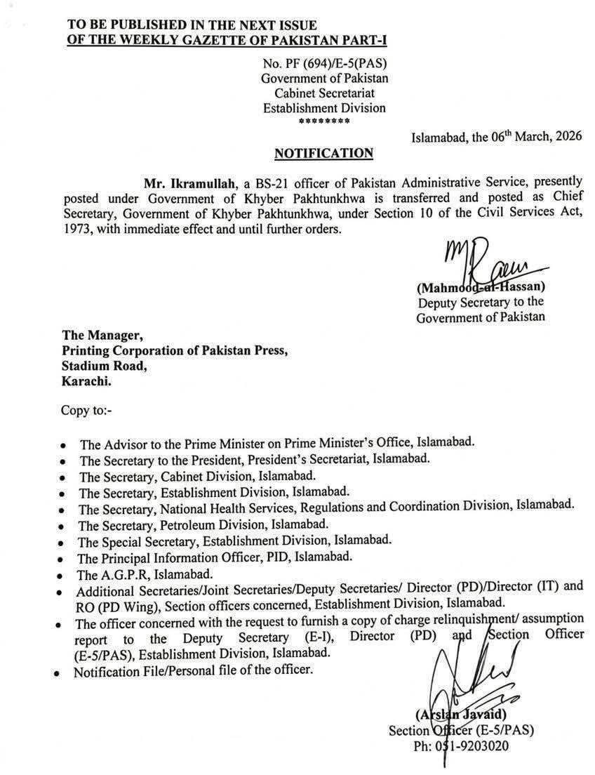 The Establishment Division, Cabinet Secretariat, has issued a notification appointing Ikramullah, a BS-21 officer of the Pakistan Administrative Service, as Chief Secretary of the Government of Khyber Pakhtunkhwa.