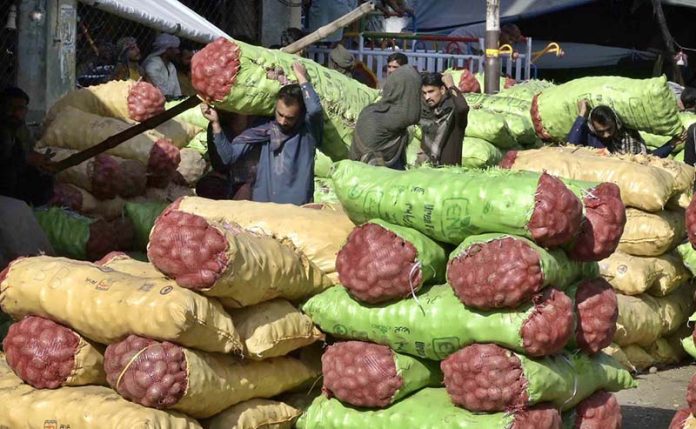 ISLAMABAD: October 09 – Labourers unloading bags of potatoes and onion from delivery truck at Fruit and Vegetable Market. APP/IFD/TZD