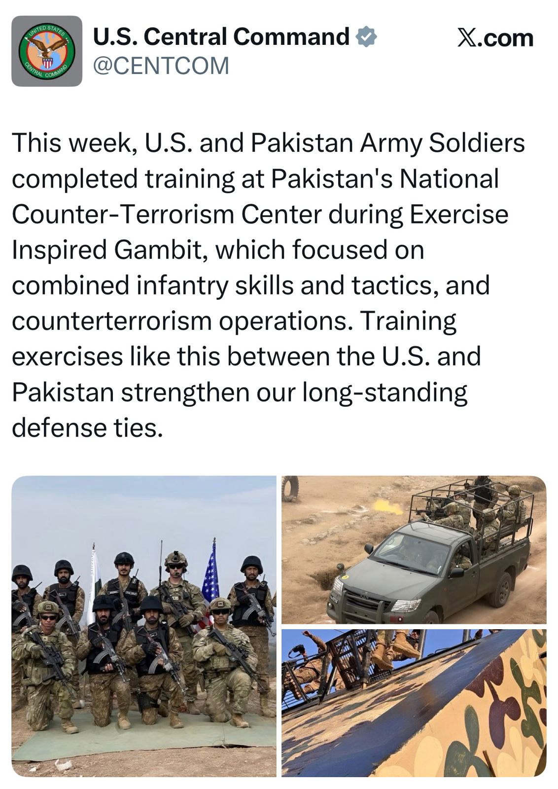 According to a statement issued on the official X account of USCENTCOM, the armies of Pakistan and the United States completed joint training during the “Inspired Gambit” exercise held at the National Counter Terrorism Centre this week.