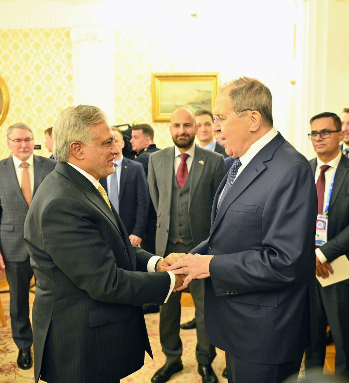 MOSCOW, Nov 19 (APP): Deputy Prime Minister and Foreign Minister Senator Mohammad Ishaq Dar met with Russian Foreign Minister Sergey Lavrov, wherein both sides reviewed the entire spectrum of bilateral relations and expressed deep satisfaction at the current positive trajectory of ties.